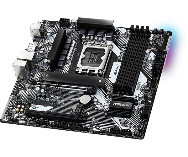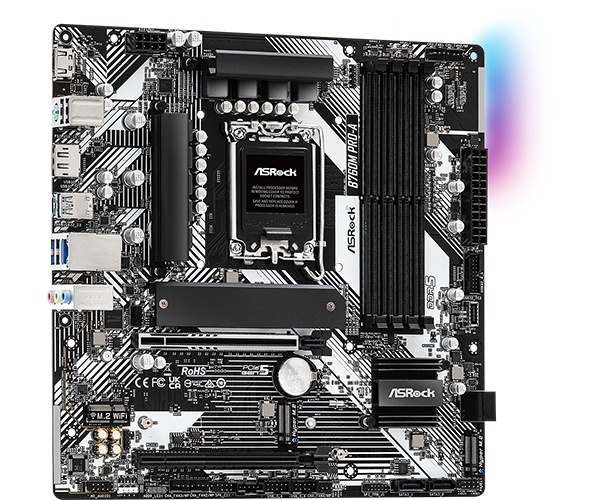 Supports 14th, 13th & 12th Gen Intel Core Processors (LGA1700). 7+1+1 Power Phase, Dr.MOS for VCore+GT. 4 x DDR5 DIMMs, supports up to 7200+ (OC). 1 PCIe 5.0 x16, 1 PCIe 3.0 x16, 1 M.2 Key E for WiFi. Graphics Output Options: 1 HDMI, 1 DisplayPort. Realtek ALC897 7.1 CH HD Audio Codec. 4 SATA3, 3 Hyper M.2 (PCIe Gen4x4). 2 USB 3.2 Gen1 Type-C (1 Rear, 1 Front). 5 USB 3.2 Gen1 Type-A (3 Rear, 2 Front). 6 USB 2.0 (2 Rear, 4 Front). Dragon 2.5G LAN. Supports ASRock Auto Driver Installer. SPECIFICATIONS : Unique Feature Superb Productivity - PCIe Gen5 (Graphics). - Dual Channel DDR5. Rock-Solid Durability : - 7+1+1 Power Phase, Dr.MOS for VCore+GT. Chipset : - Intel B760. Memory : - Dual Channel DDR5 Memory Technology. - 4 x DDR5 DIMM Slots. - Supports DDR5 non-ECC, un-buffered memory up to 7200+(OC)*. - Max. capacity of system memory: 192GB. - Supports Intel Extreme Memory Profile (XMP) 3.0. Form Factor : - Micro ATX Form Factor: 9.6-in x 9.6-in, 24.4 cm x 24.4 cm. (Call For Stock)